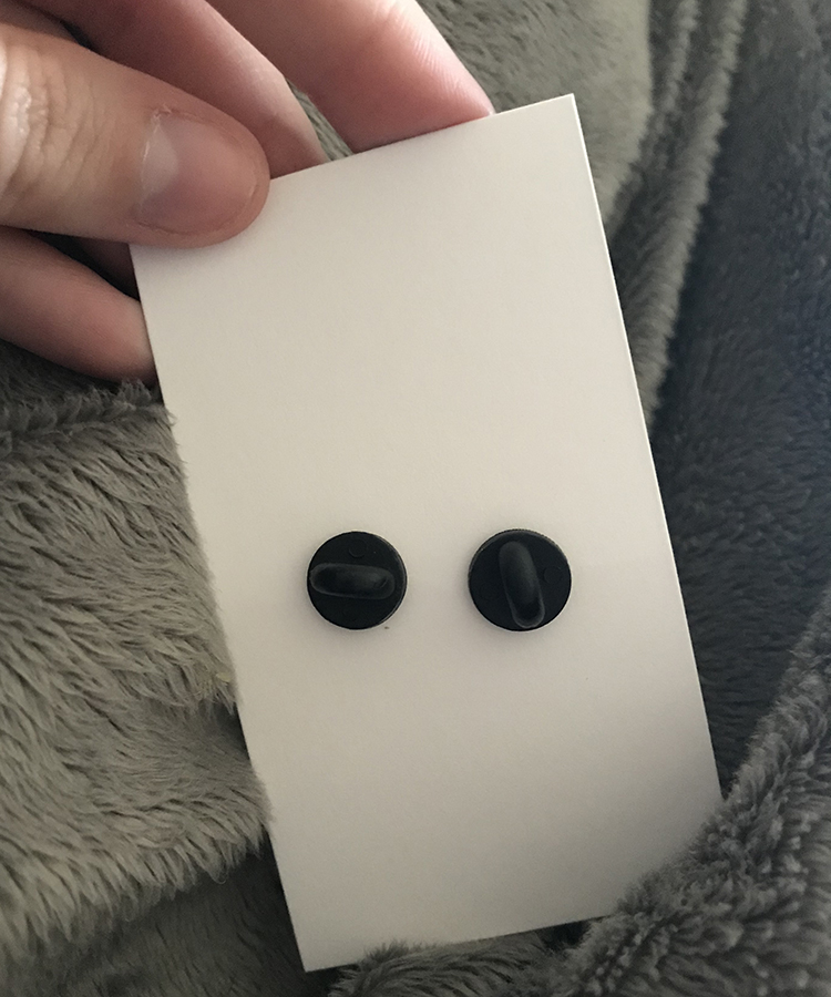 each pin is 1.25" wide and has two clasps for maximum security, comes default with rubber clasps but also includes two locking backs so they won't fall off your bag/hat/etc!!